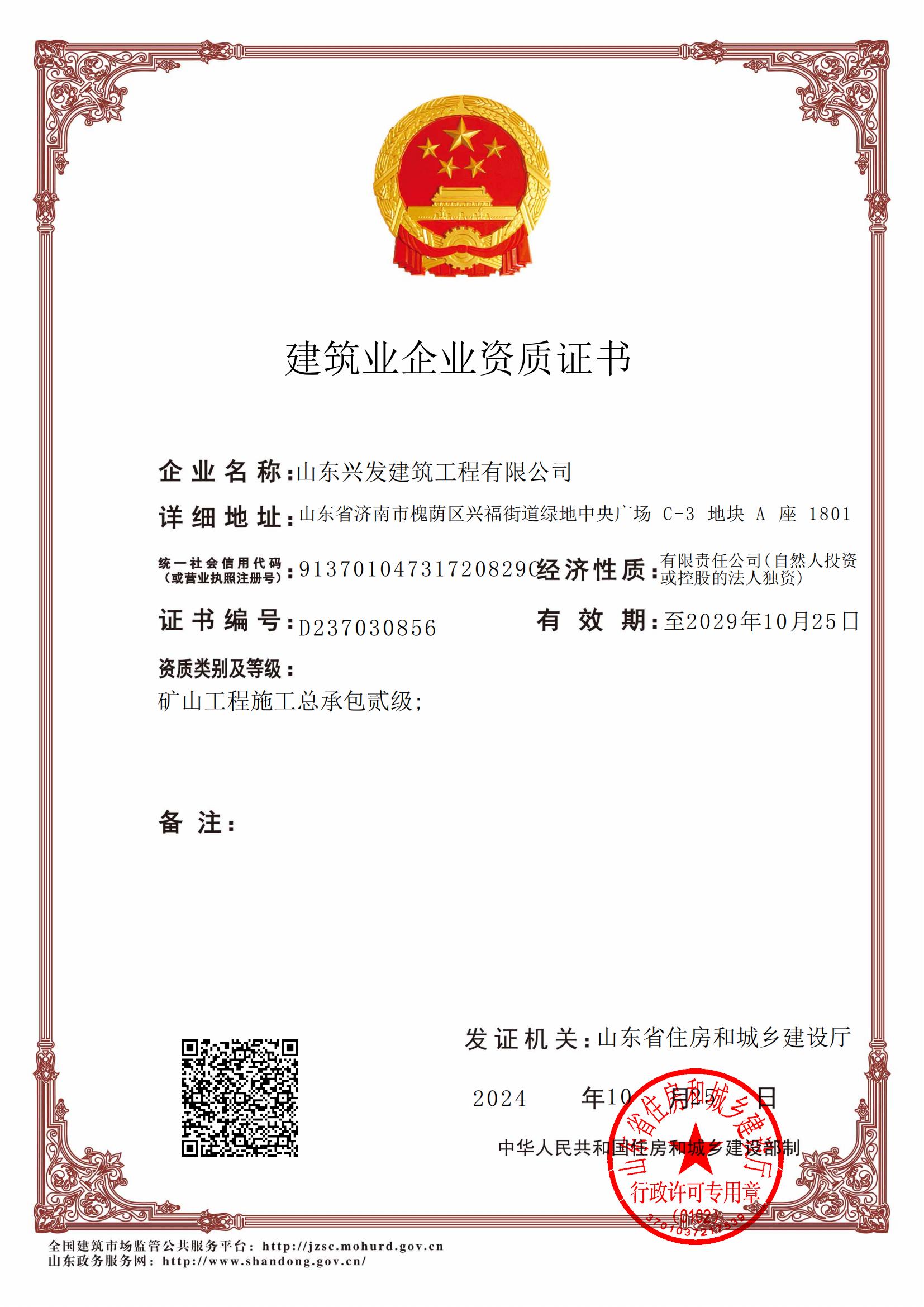 山東興發(fā)建筑工程有限公司資質(zhì)證書